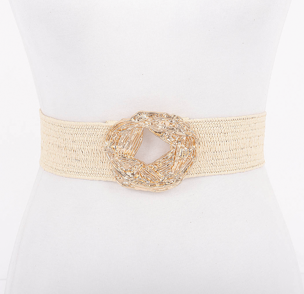 Beige Metal Buckle Elastic Faux Straw Belt