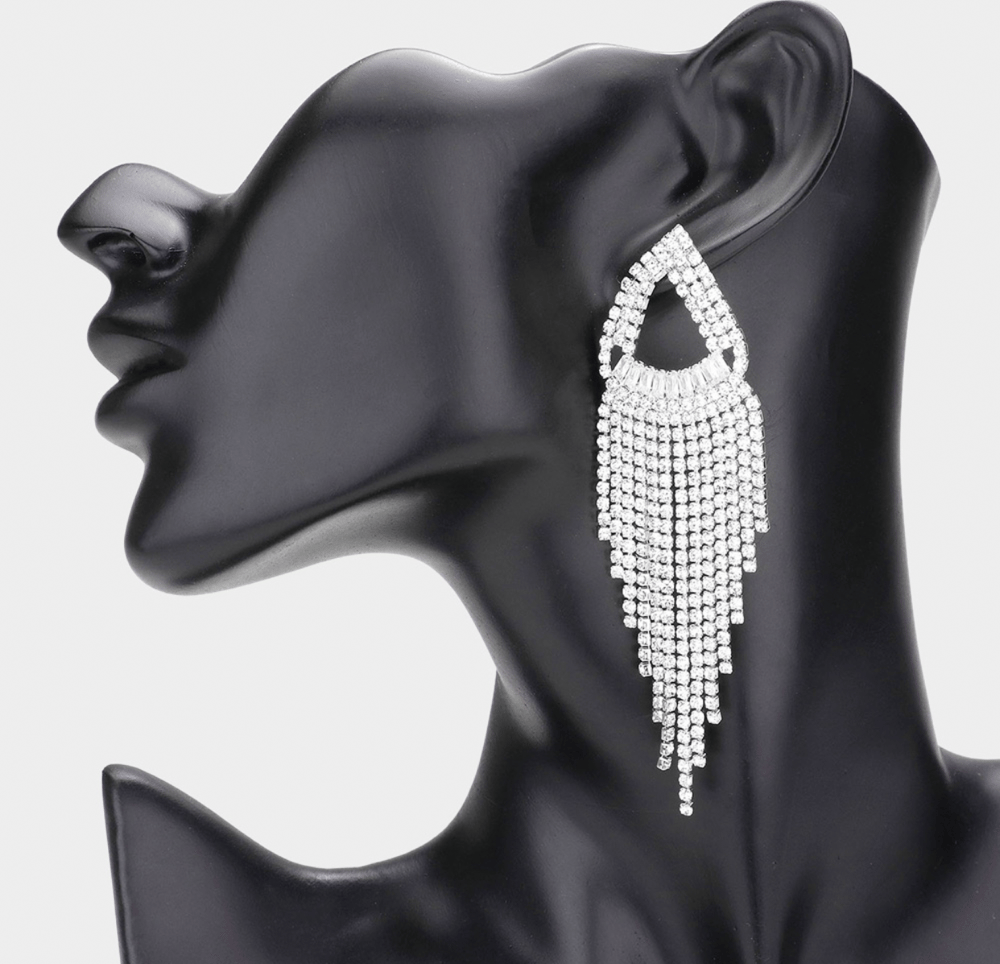 Glamorous open teardrop dangle earrings with cascading rhinestone fringe. Lightweight yet dramatic—perfect for evening wear, special events, or stage-ready sparkle.